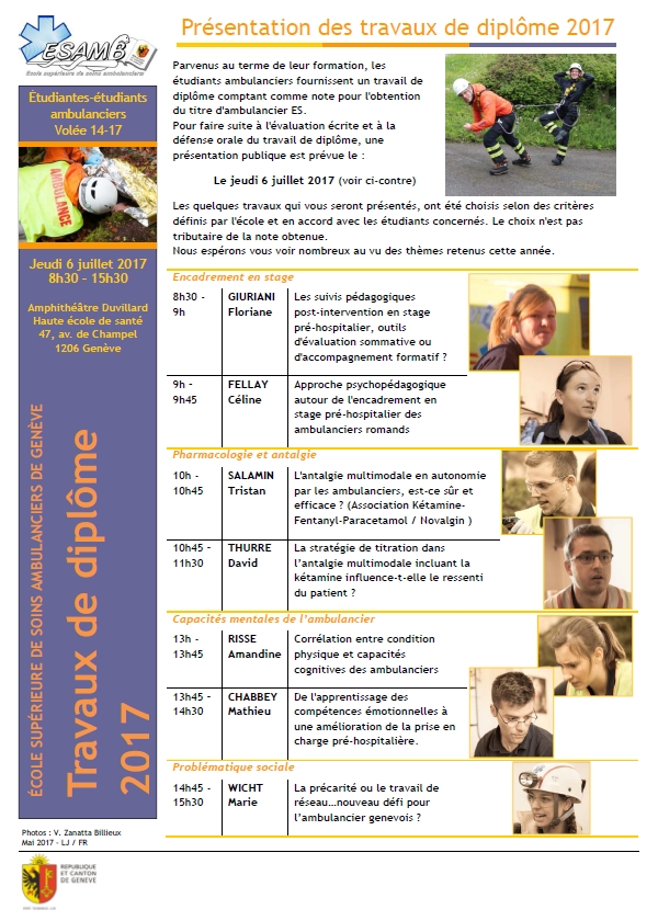 Parvenus au terme de leur formation, les étudiants ambulanciers de Genève vous proposent de venir les suivre pour quelques présentations de leurs travaux de diplôme le jeudi 6 juillet 2017. Lien vers le document de pr…
