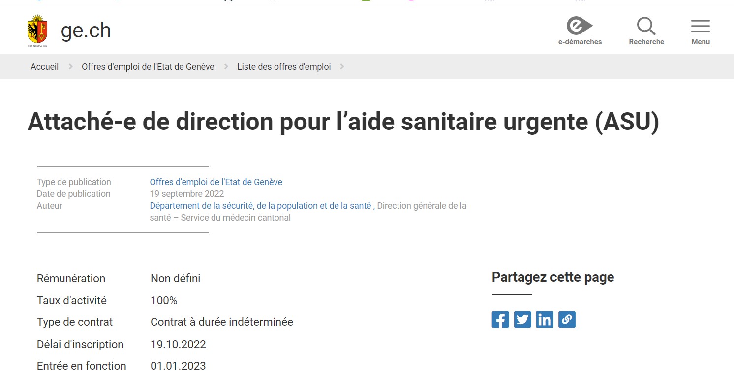 Il y a des opportunités qui ne se présentent pas tous les jours ! La Direction générale de la santé (DGS) de l'Etat de Genève met au concours un poste d'attaché-e de direction pour l’aide sanitaire urgente (ASU). Un e…