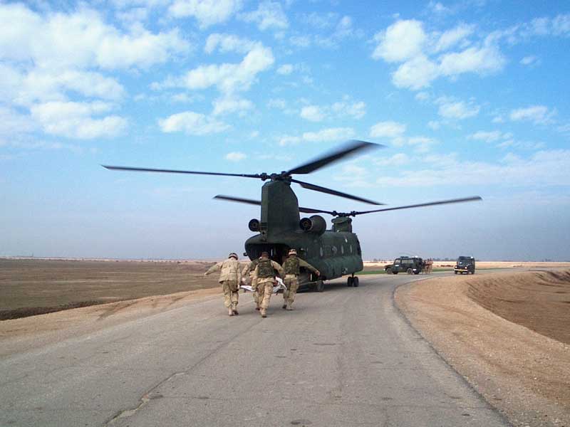 En janvier 2004, hélicoptère Chinook hollandais de la SFIR en mission d'évacuation médicale, peu avant le retrait hollandais de la coalition.